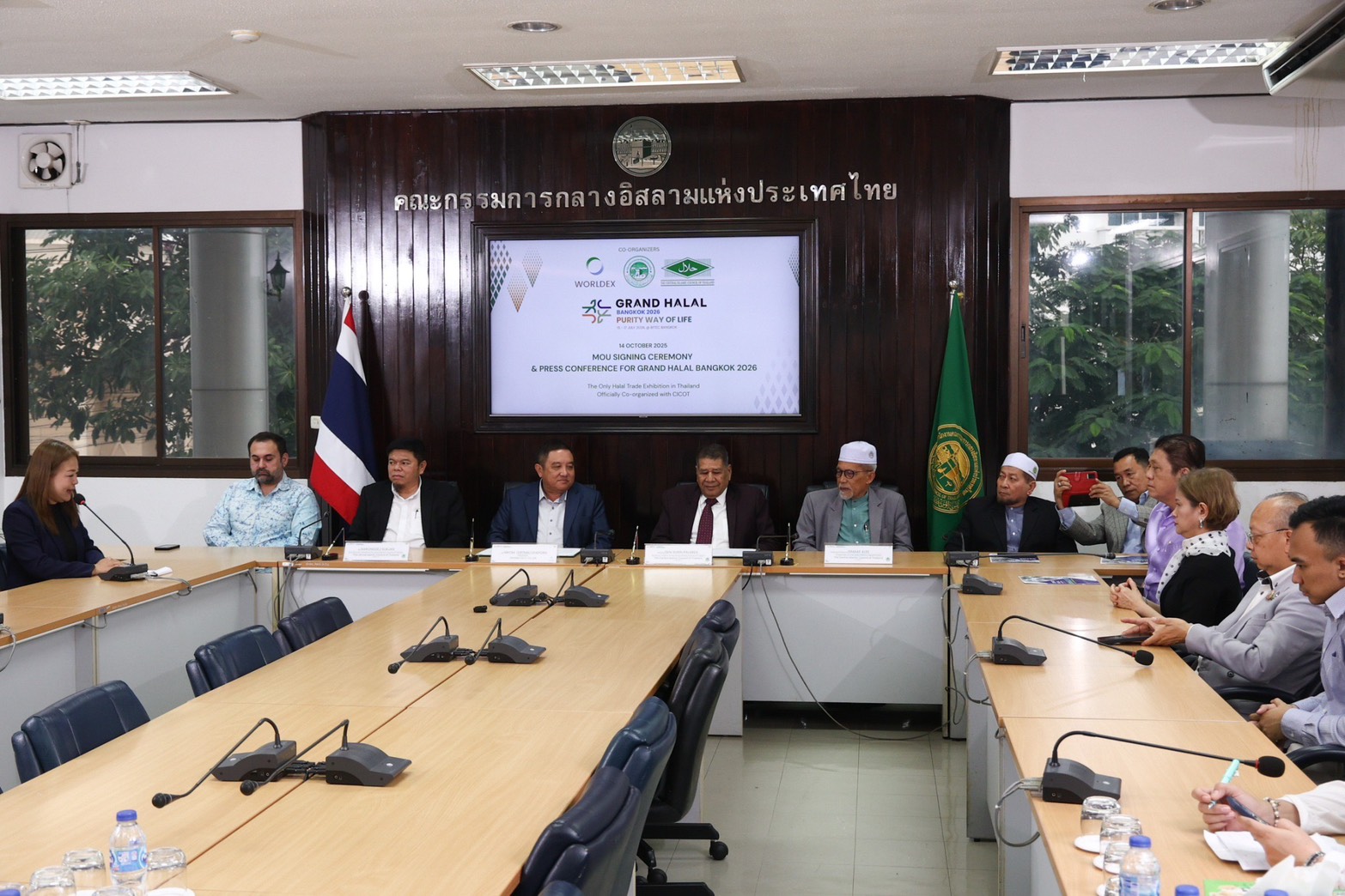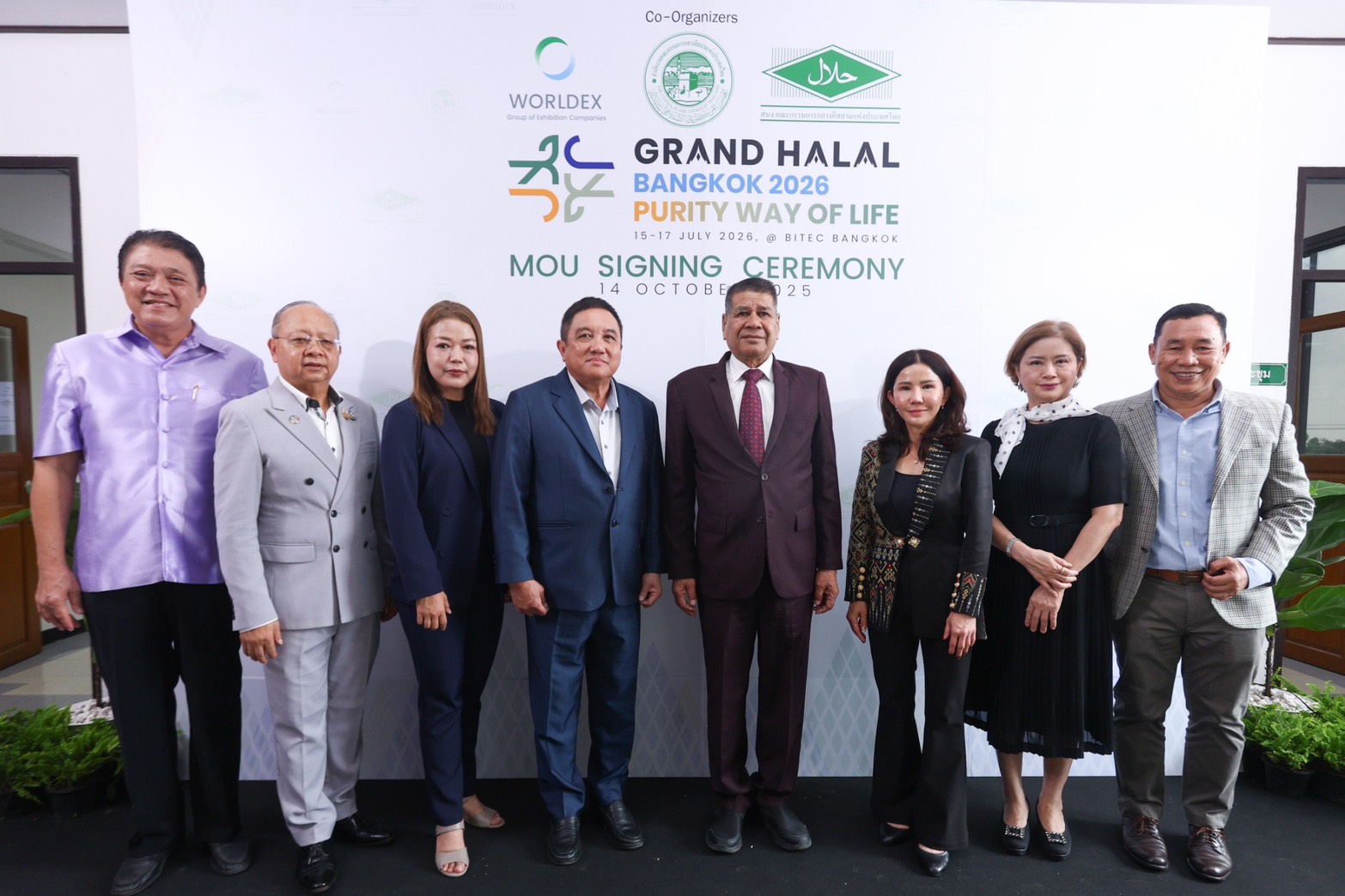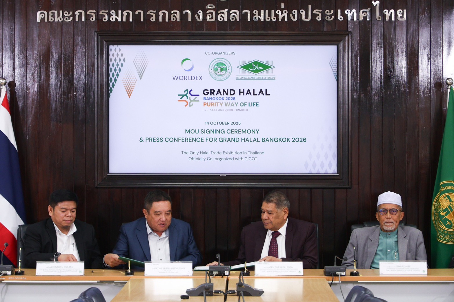 สำนักข่าวอะลามี่ : คณะกรรมการกลางอิสลามแห่งประเทศไทย (CICOT) ร่วมกับ บริษัท Worldex G.E.C. Co.,Ltd ลงนามบันทึกข้อตกลงความร่วมมือ (MOU) ในการจัดงาน “Grand Halal Bangkok 2026” ซึ่งจะเป็นเวทีสำคัญในการผลักดันประเทศไทยให้ก้าวขึ้นเป็นศูนย์กลางของ เศรษฐกิจฮาลาลโลก (The Global Halal Economy) ภายใต้แนวคิด “Purity Way of Life” พิธีลงนามจัดขึ้นเมื่อวันที่ 14 ตุลาคม 2568 ณ สำนักงานคณะกรรมการกลางอิสลามแห่งประเทศไทยกรุงเทพมหานคร โดยมีผู้บริหารจากทั้งสององค์กร แขกผู้มีเกียรติจากภาครัฐ เอกชน และสื่อมวลชนเข้าร่วมอย่างคับคั่ง