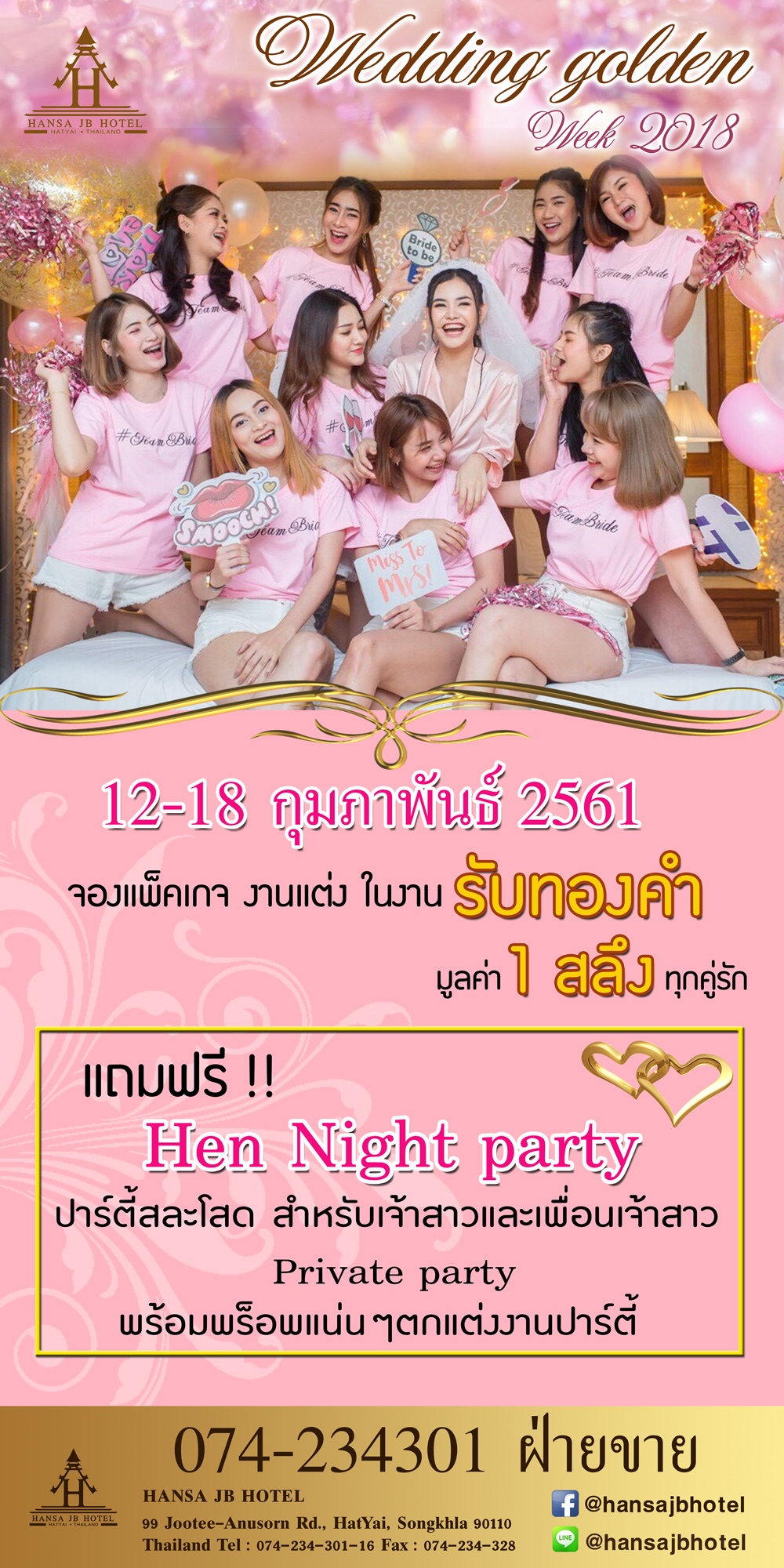 เวลาสำคัญสำหรับคู่รัก มาถึงแล้ว HANSA JB WEDDING GOLDEN WEEK 12-18 กุมภาพันธ์ 2561 ณ ห้อง Galleria บริเวณ ล็อบบี้ โรงแรมหรรษาเจบี หาดใหญ่