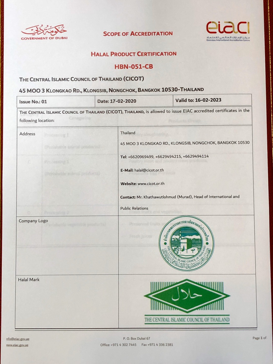 โดยได้รับเกียรติจาก นายชัยรัตน์ ศิริวัฒน์ กงสุลใหญ่ ณ เมืองดูไบ เข้ารับมอบใบรับรองอย่างเป็นทางการ ซึ่งผลความสำเร็จที่น่ายินดีนี้ เป็นการการันตีในมาตรฐานฮาลาล ของไทย และจะช่วยเปิดทางให้สินค้าฮาลาลของไทย โดยเฉพาะสินค้าเนื้อสัตว์ปีก ให้สามารถส่งออกไปยังสหรัฐอาหรับเอมิเรตส์ได้ หลังจากที่ประเทศไทยถูกระงับการส่งสินค้าฮาลาล เนื่องจากประเทศสหรัฐอาหรับเอมิเรตส์ ได้เปลี่ยนแปลงข้อกำหนดนำเข้าสินค้าฮาลาลใหม่ตั้งแต่ปี พ.ศ.2560